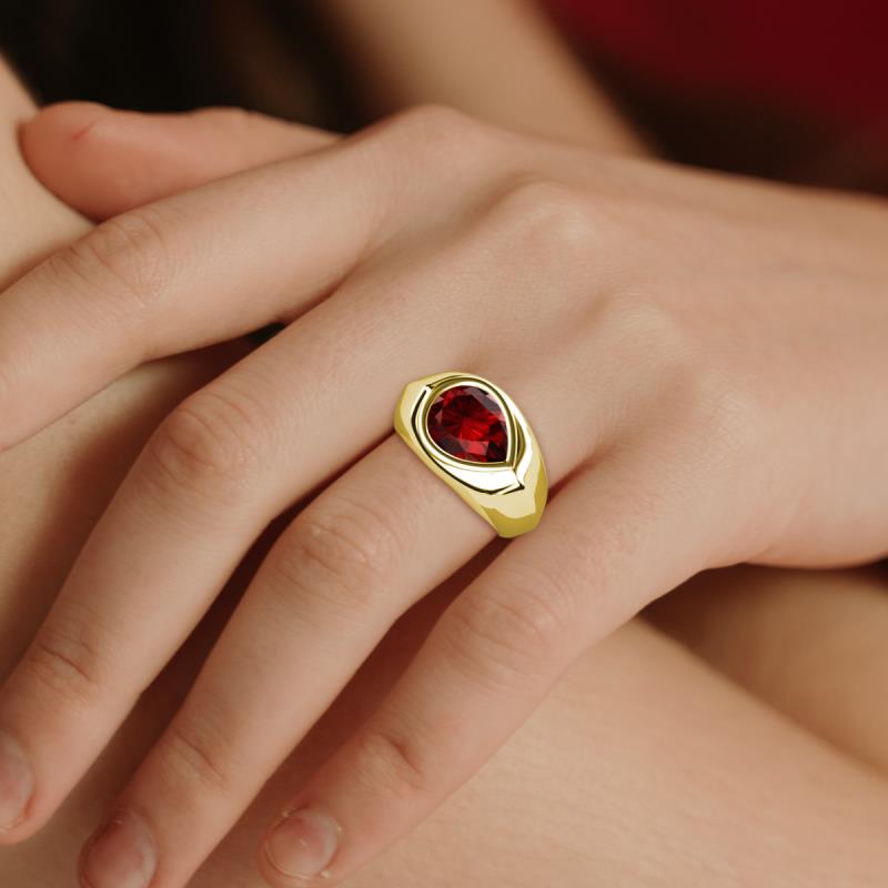 Designed for those who appreciate bold elegance, this Pear-shaped Red Garnet Solitaire Ring features a flush-set design making it a perfect statement piece for any occasion.