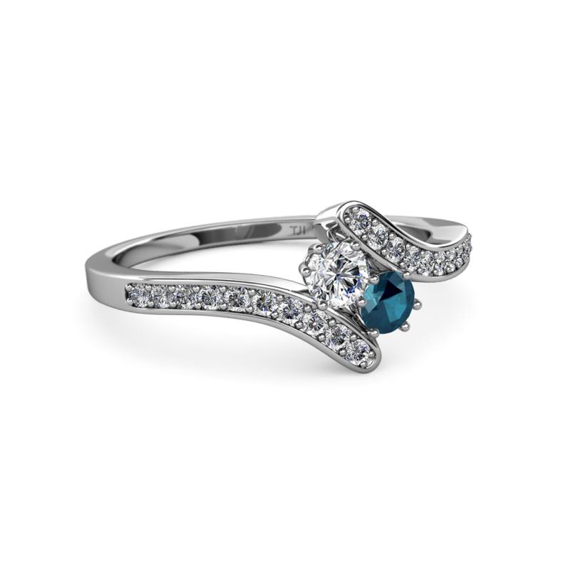 Round Blue and White Diamond 2 Stone with Side Diamonds Bypass Engagement Ring 0.70 Carat tw in 14K White Gold. More Details ...