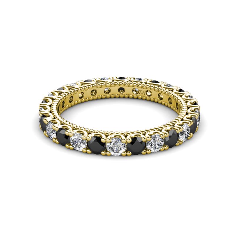 This stunning Eternity Band is Ornamented with striking U-Prong set Black and White Diamond with rope like milgrain embellished all the way around the shank.