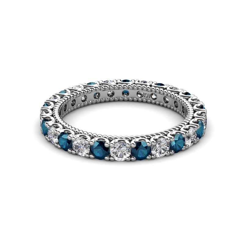 This stunning Eternity Band is Ornamented with striking U-Prong set Blue and White Diamond with rope like milgrain embellished all the way around the shank. *As per ring size the stone and carat total weight changes.