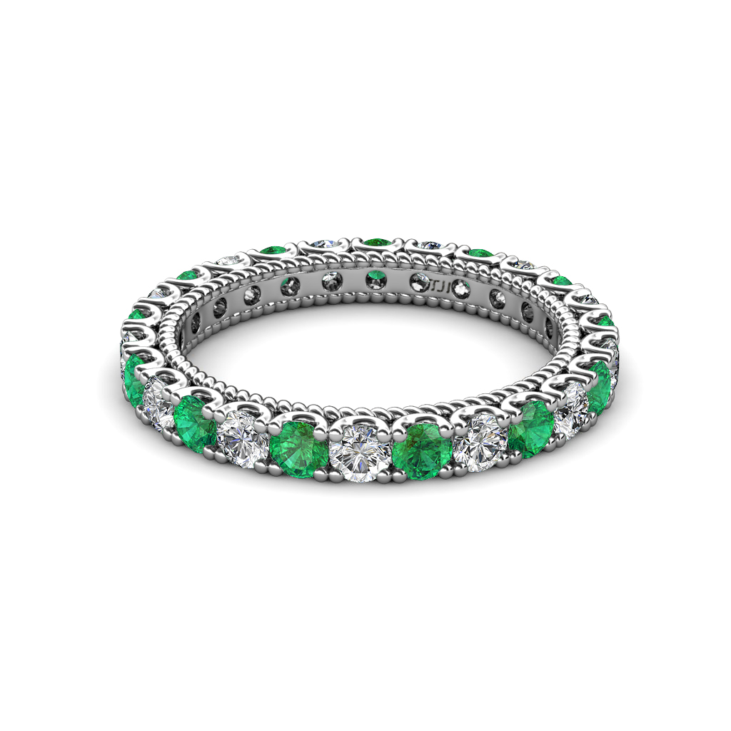 This stunning Eternity Band is Ornamented with striking U-Prong set Emerald and Diamond with rope like milgrain embellished all the way around the shank.