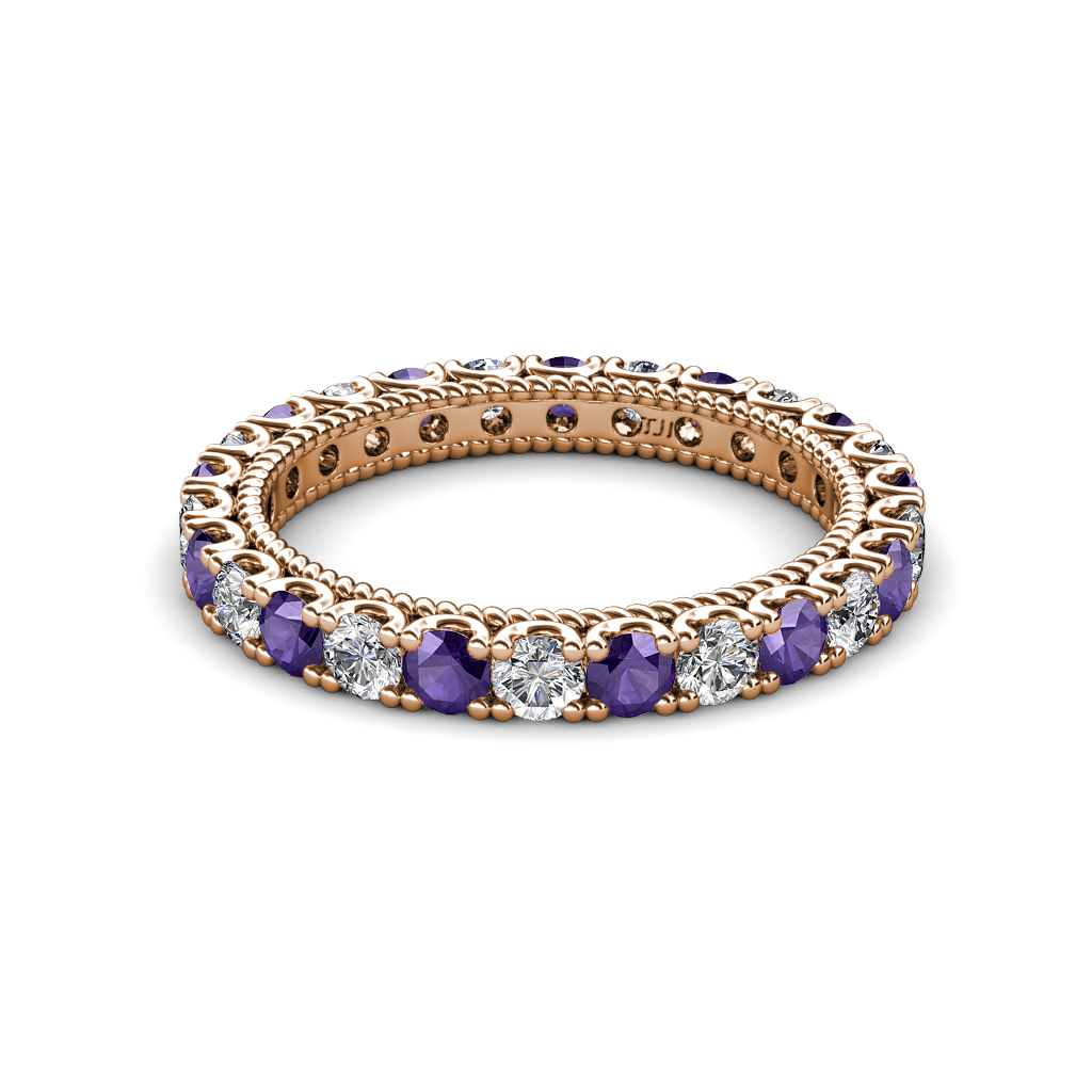 This stunning Eternity Band is Ornamented with striking U-Prong set Iolite and Diamond with rope like milgrain embellished all the way around the shank.