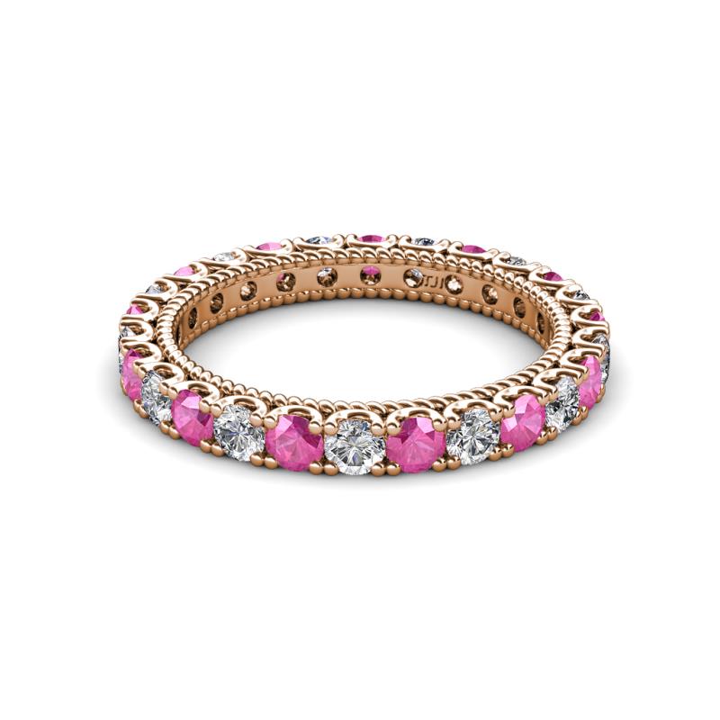 This stunning Eternity Band is Ornamented with striking U-Prong set Pink Sapphire and Diamond with rope like milgrain embellished all the way around the shank. *As per ring size the stone and carat total weight changes.