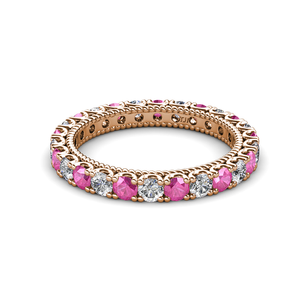 This stunning Eternity Band is Ornamented with striking U-Prong set Pink Sapphire and Lab Grown Diamond with rope like milgrain embellished all the way around the shank.