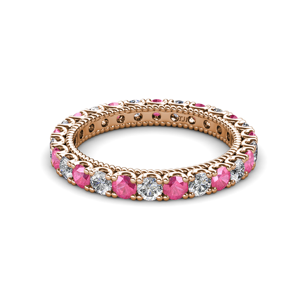 This stunning Eternity Band is Ornamented with striking U-Prong set Pink Tourmaline and Lab Grown Diamond with rope like milgrain embellished all the way around the shank.
