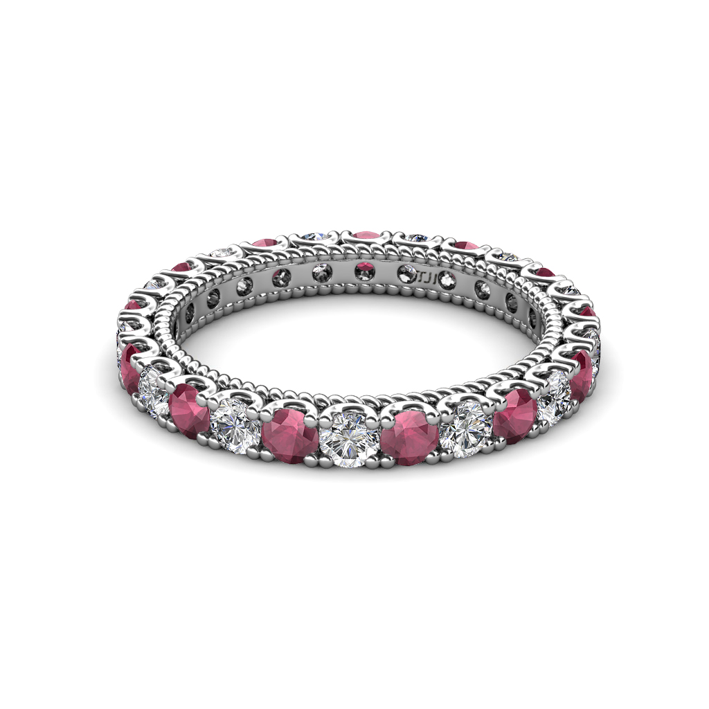 This stunning Eternity Band is Ornamented with striking U-Prong set Rhodolite Garnet and Diamond with rope like milgrain embellished all the way around the shank.