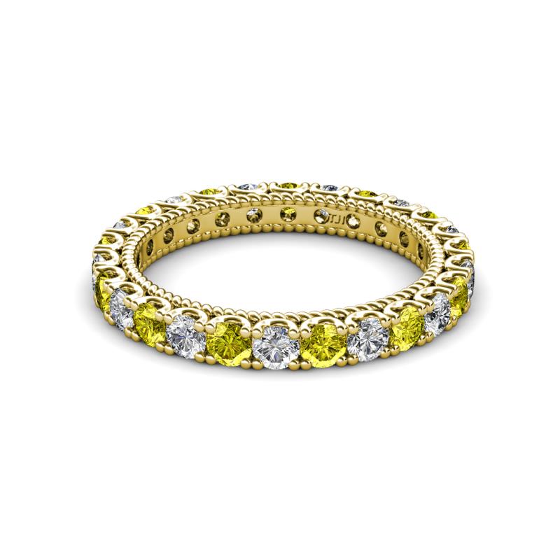 This stunning Eternity Band is Ornamented with striking U-Prong set Yellow and White Diamond with rope like milgrain embellished all the way around the shank. *As per ring size the stone and carat total weight changes.