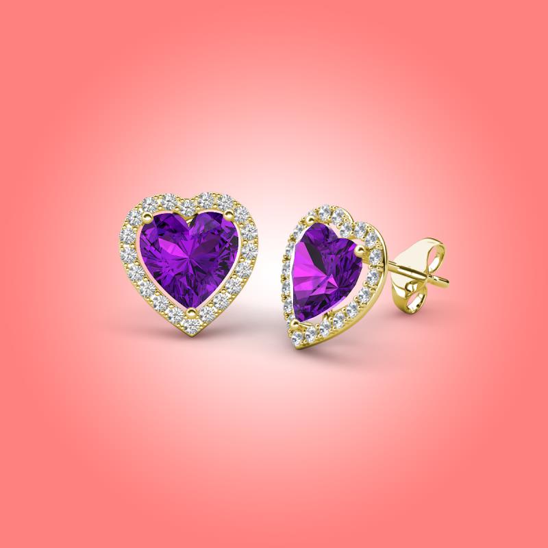 The beautiful pair of heart shaped stud earrings of 2.54 ctw with elegant center Amethyst surrounded with 40 sparkilng Round Natural Diamond in halo style with post and puchback backfindings & safely secured in prong settings, symbolizes the Love & Affection for your loved ones.