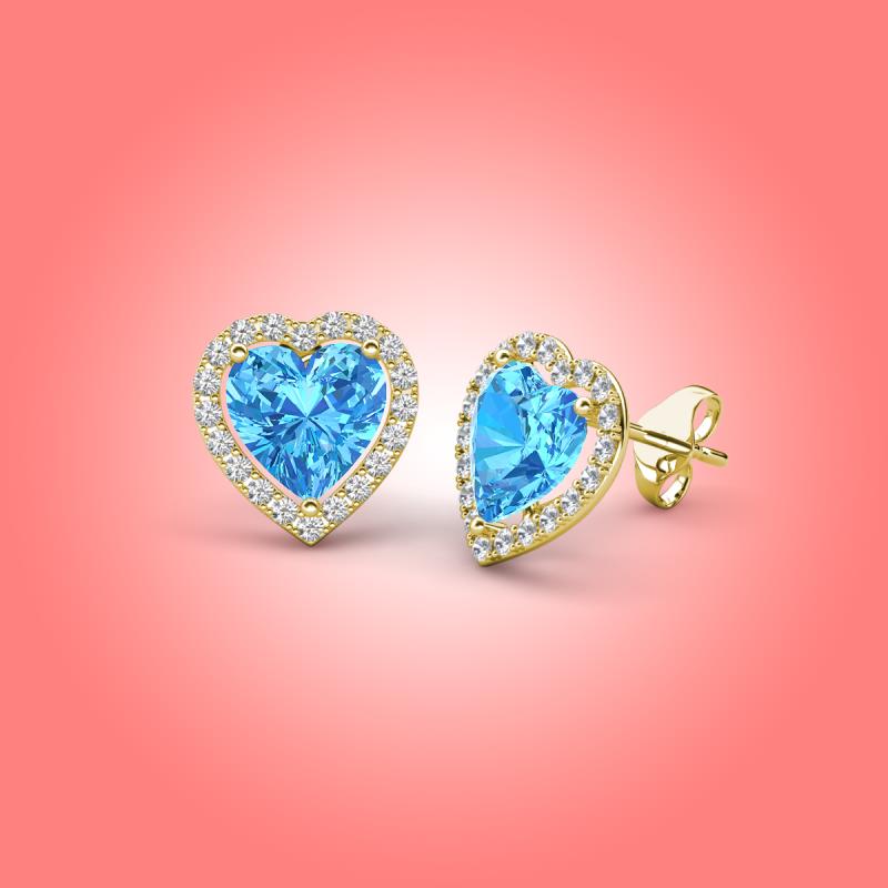 The beautiful pair of heart shaped stud earrings of 3.44 ctw with elegant center Blue Topaz surrounded with 40 sparkilng Round Natural Diamond in halo style with post and puchback backfindings & safely secured in prong settings, symbolizes the Love & Affection for your loved ones.