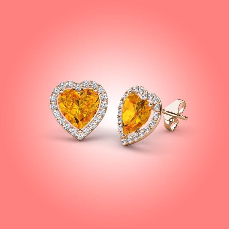 The beautiful pair of heart shaped stud earrings of 2.38 ctw with elegant center Citrine surrounded with 40 sparkilng Round Natural Diamond in halo style with post and puchback backfindings & safely secured in prong settings, symbolizes the Love & Affection for your loved ones.