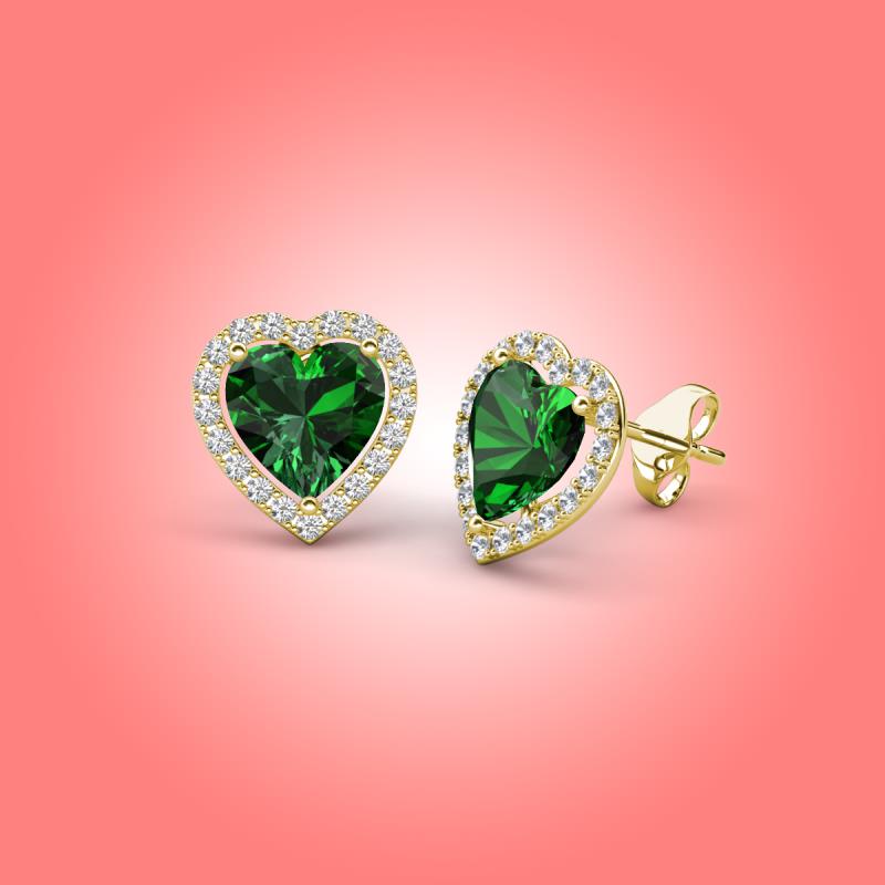 The beautiful pair of heart shaped stud earrings of 2.44 ctw with elegant center Created Emerald surrounded with 40 sparkilng Round Natural Diamond in halo style with post and puchback backfindings & safely secured in prong settings, symbolizes the Love & Affection for your loved ones.