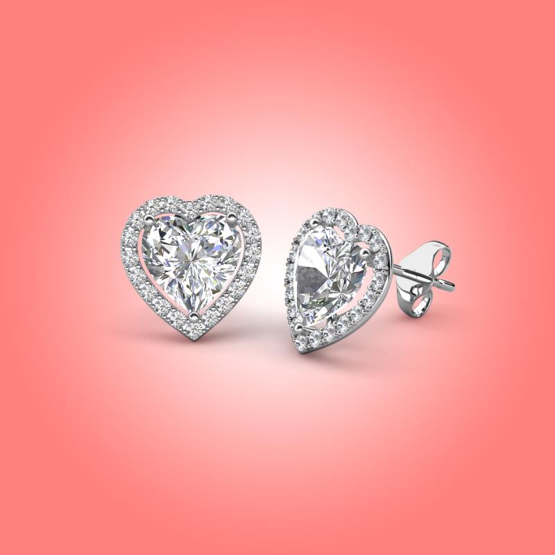 The beautiful pair of heart shaped stud earrings of 2.44 ctw with elegant center Moissanite surrounded with 40 sparkilng Round Natural Diamond in halo style with post and puchback backfindings & safely secured in prong settings, symbolizes the Love & Affection for your loved ones.