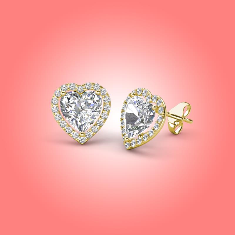 The beautiful pair of heart shaped stud earrings of 2.44 ctw with elegant center Moissanite surrounded with 40 sparkilng Round Natural Diamond in halo style with post and puchback backfindings & safely secured in prong settings, symbolizes the Love & Affection for your loved ones.