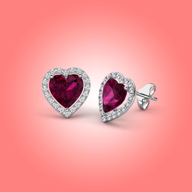 The beautiful pair of heart shaped stud earrings of 3.04 ctw with elegant center Rhodolite Garnet surrounded with 40 sparkilng Round Natural Diamond in halo style with post and puchback backfindings & safely secured in prong settings, symbolizes the Love & Affection for your loved ones.