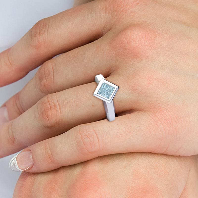 This Solitaire Ring have Princess Cut Aquamarine surrounded elegantly by bezel setting making it more Graceful in its Simplicity.