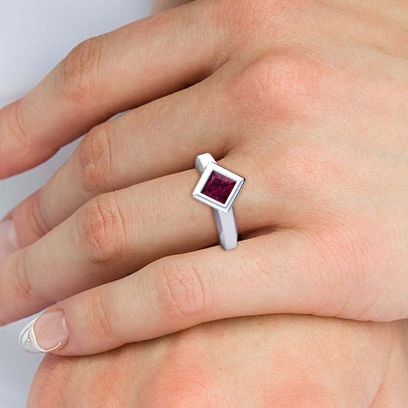 This Solitaire Ring have Princess Cut Rhodolite Garnet surrounded elegantly by bezel setting making it more Graceful in its Simplicity.