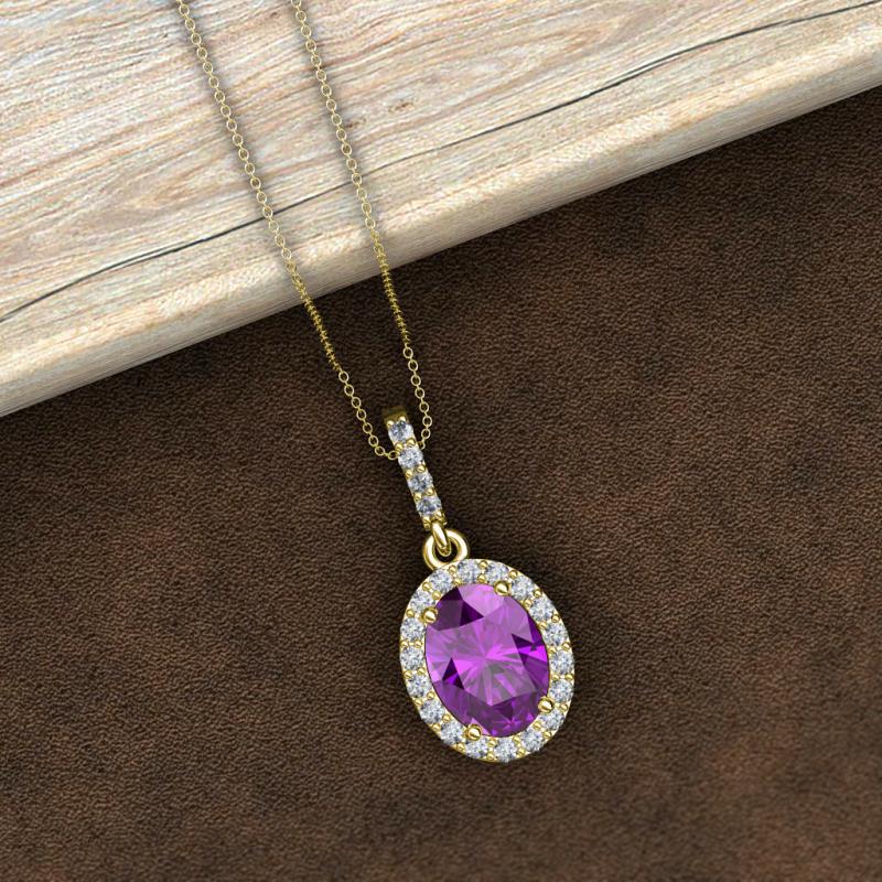 Oval Cut (8x6 mm) Amethyst and Round Diamond 1 1/2 ctw Womens Halo Pendant Necklace 14K Yellow Gold.Included 16 Inches 14K Yellow Gold Chain More Details ...