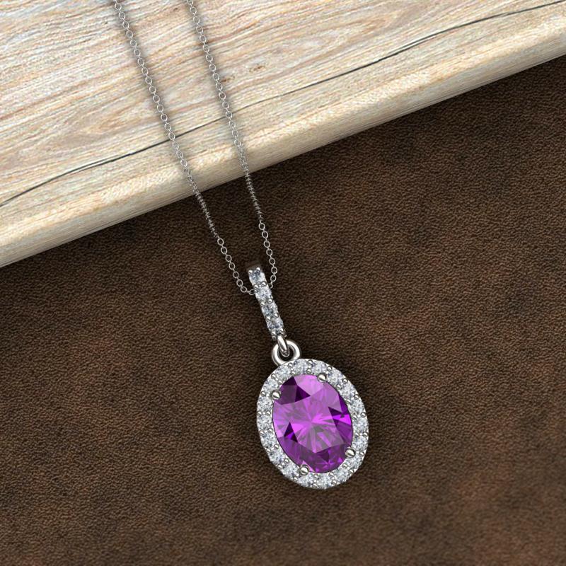 Oval Cut (8x6 mm) Amethyst and Round Diamond 1 1/2 ctw Womens Halo Pendant Necklace 18K White Gold.Included 16 Inches 18K White Gold Chain More Details ...