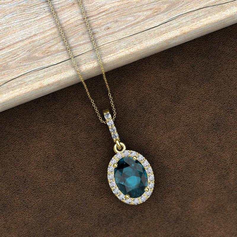 Oval Cut (8x6 mm) London Blue Topaz and Round Diamond 1 3/4 ctw Womens Halo Pendant Necklace 14K Yellow Gold.Included 16 Inches 14K Yellow Gold Chain More Details ...