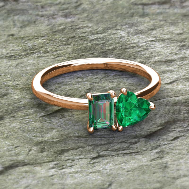 Simple and beautiful, this enchanting 2 Stone Duo Ring flaunting an Emerald Shape Lab Created Alexandrite dazzling along with Heart Shape Lab Created Emerald are perfect for the women who have a modern outlook and are willing to be unique.