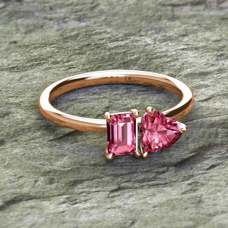 Simple and beautiful, this enchanting 2 Stone Duo Ring flaunting an Emerald Shape Pink Tourmaline dazzling along with Heart Shape Pink Tourmaline are perfect for the women who have a modern outlook and are willing to be unique.