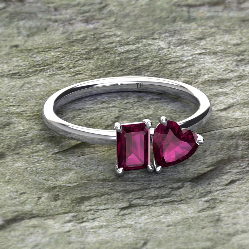 Simple and beautiful, this enchanting 2 Stone Duo Ring flaunting an Emerald Shape Rhodolite Garnet dazzling along with Heart Shape Rhodolite Garnet are perfect for the women who have a modern outlook and are willing to be unique.