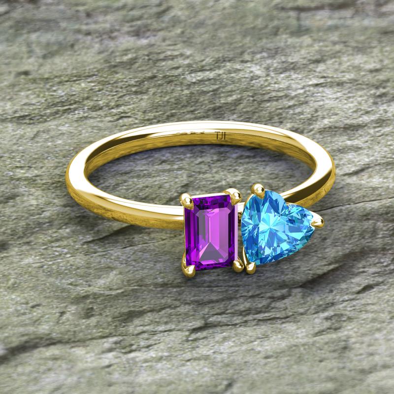 Simple and beautiful, this enchanting 2 Stone Duo Ring flaunting an Emerald Shape Amethyst dazzling along with Heart Shape Blue Topaz are perfect for the women who have a modern outlook and are willing to be unique.