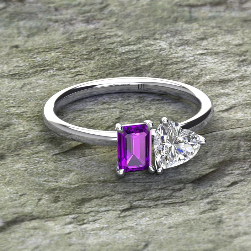 Simple and beautiful, this enchanting 2 Stone Duo Ring flaunting an Emerald Shape Amethyst dazzling along with Heart Shape Forever Brilliant Moissanite are perfect for the women who have a modern outlook and are willing to be unique.