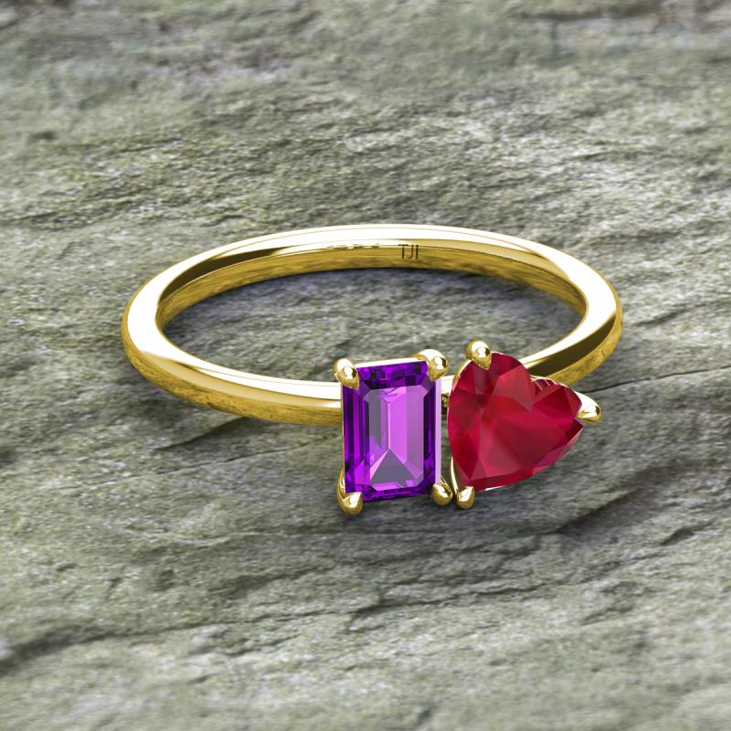Simple and beautiful, this enchanting 2 Stone Duo Ring flaunting an Emerald Shape Amethyst dazzling along with Heart Shape Lab Created Ruby are perfect for the women who have a modern outlook and are willing to be unique.