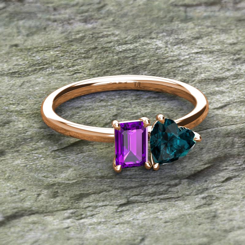Simple and beautiful, this enchanting 2 Stone Duo Ring flaunting an Emerald Shape Amethyst dazzling along with Heart Shape London Blue Topaz are perfect for the women who have a modern outlook and are willing to be unique.