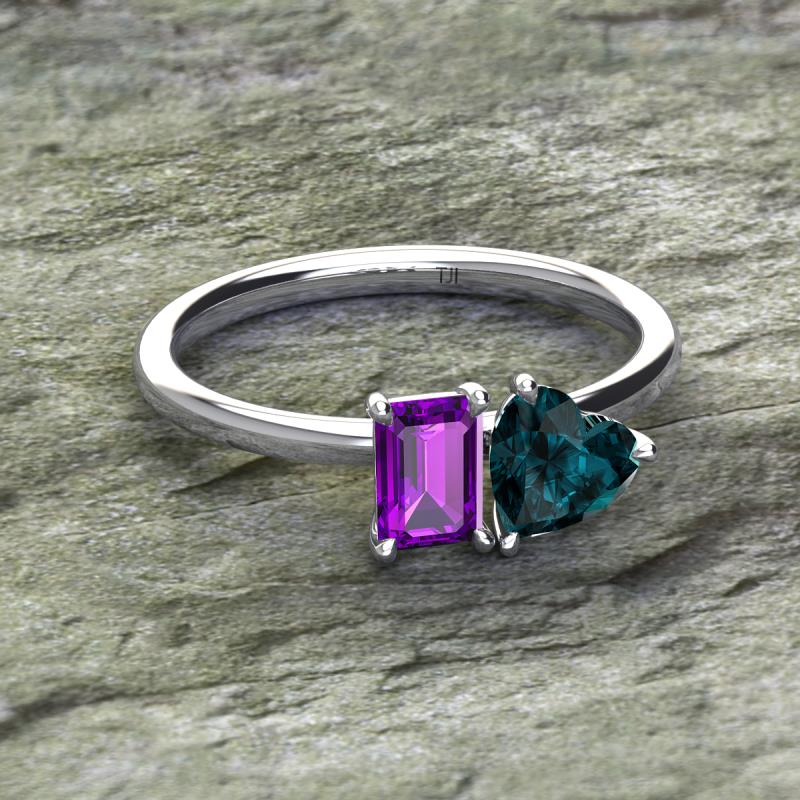 Simple and beautiful, this enchanting 2 Stone Duo Ring flaunting an Emerald Shape Amethyst dazzling along with Heart Shape London Blue Topaz are perfect for the women who have a modern outlook and are willing to be unique.
