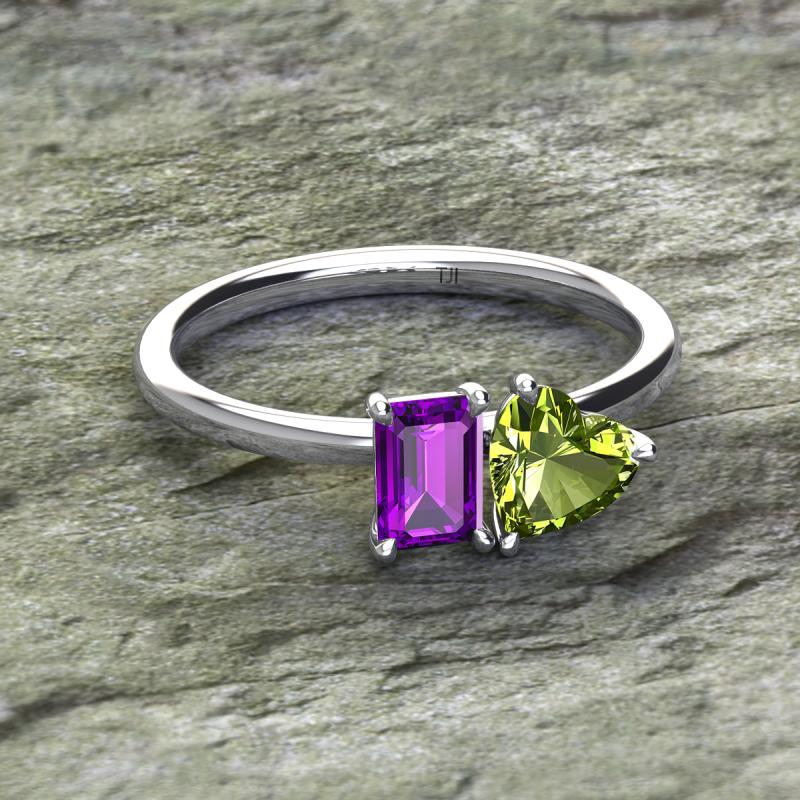 Simple and beautiful, this enchanting 2 Stone Duo Ring flaunting an Emerald Shape Amethyst dazzling along with Heart Shape Peridot are perfect for the women who have a modern outlook and are willing to be unique.