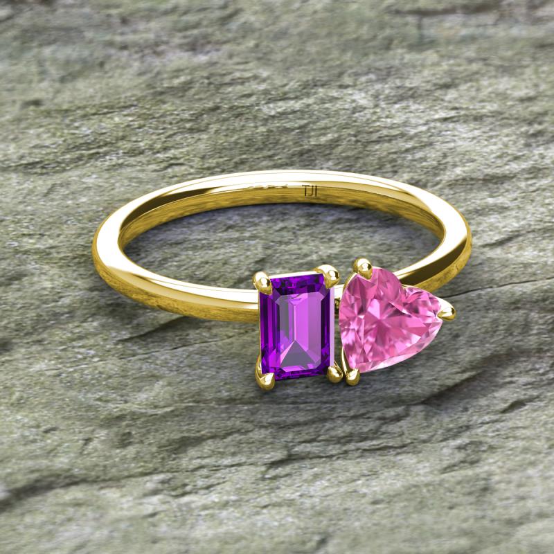 Simple and beautiful, this enchanting 2 Stone Duo Ring flaunting an Emerald Shape Amethyst dazzling along with Heart Shape Pink Sapphire are perfect for the women who have a modern outlook and are willing to be unique.