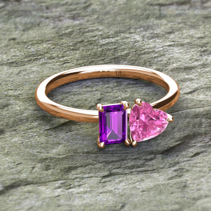 Simple and beautiful, this enchanting 2 Stone Duo Ring flaunting an Emerald Shape Amethyst dazzling along with Heart Shape Pink Sapphire are perfect for the women who have a modern outlook and are willing to be unique.