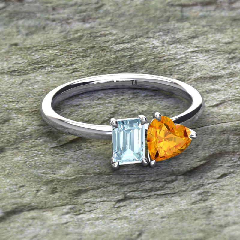 Simple and beautiful, this enchanting 2 Stone Duo Ring flaunting an Emerald Shape Aquamarine dazzling along with Heart Shape Citrine are perfect for the women who have a modern outlook and are willing to be unique.