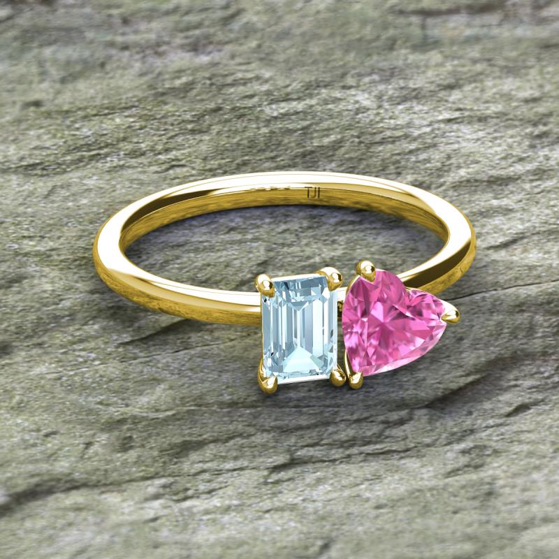 Simple and beautiful, this enchanting 2 Stone Duo Ring flaunting an Emerald Shape Aquamarine dazzling along with Heart Shape Pink Sapphire are perfect for the women who have a modern outlook and are willing to be unique.