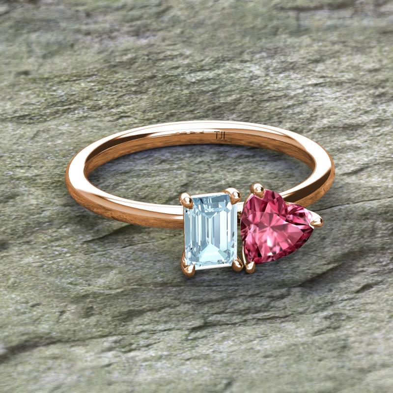 Simple and beautiful, this enchanting 2 Stone Duo Ring flaunting an Emerald Shape Aquamarine dazzling along with Heart Shape Pink Tourmaline are perfect for the women who have a modern outlook and are willing to be unique.