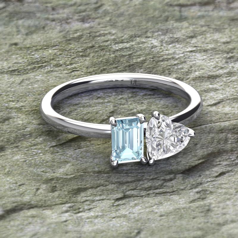 Simple and beautiful, this enchanting 2 Stone Duo Ring flaunting an Emerald Shape Aquamarine dazzling along with Heart Shape White Sapphire are perfect for the women who have a modern outlook and are willing to be unique.