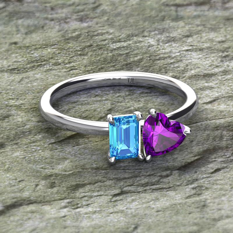 Simple and beautiful, this enchanting 2 Stone Duo Ring flaunting an Emerald Shape Blue Topaz dazzling along with Heart Shape Amethyst are perfect for the women who have a modern outlook and are willing to be unique.
