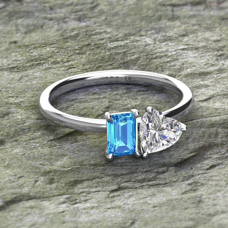 Simple and beautiful, this enchanting 2 Stone Duo Ring flaunting an Emerald Shape Blue Topaz dazzling along with Heart Shape Forever One Moissanite are perfect for the women who have a modern outlook and are willing to be unique.