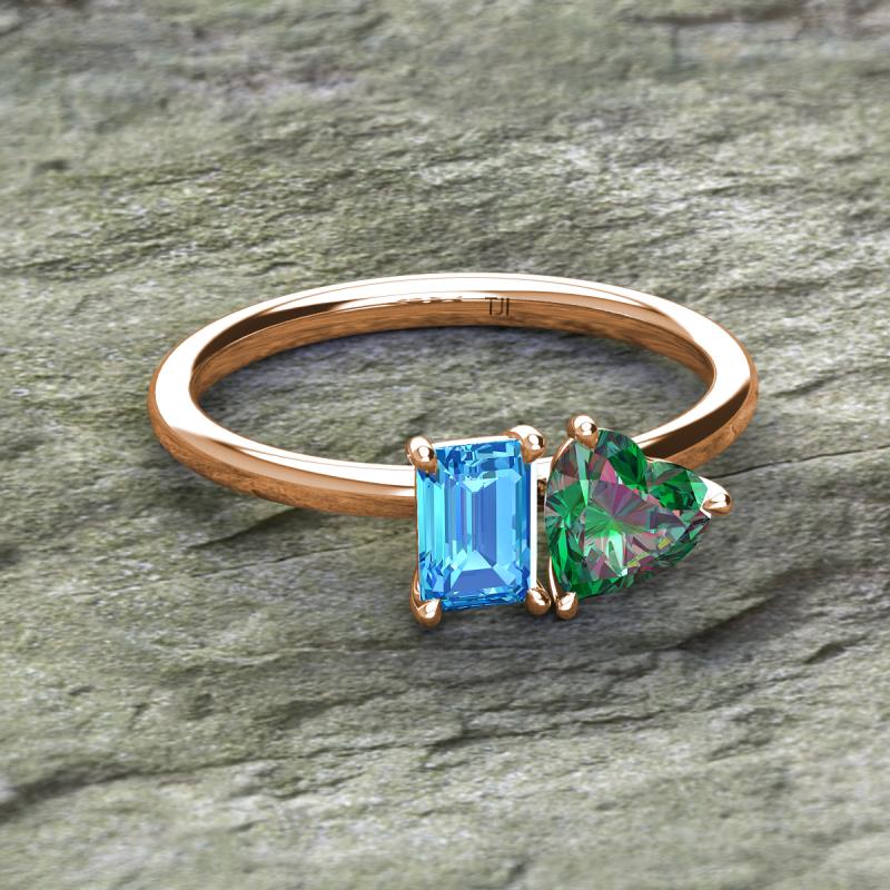 Simple and beautiful, this enchanting 2 Stone Duo Ring flaunting an Emerald Shape Blue Topaz dazzling along with Heart Shape Lab Created Alexandrite are perfect for the women who have a modern outlook and are willing to be unique.