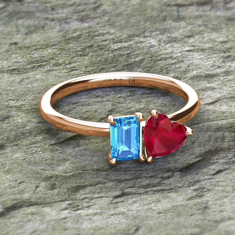 Simple and beautiful, this enchanting 2 Stone Duo Ring flaunting an Emerald Shape Blue Topaz dazzling along with Heart Shape Lab Created Ruby are perfect for the women who have a modern outlook and are willing to be unique.