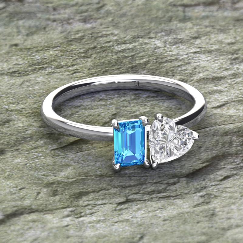 Simple and beautiful, this enchanting 2 Stone Duo Ring flaunting an Emerald Shape Blue Topaz dazzling along with Heart Shape White Sapphire are perfect for the women who have a modern outlook and are willing to be unique.