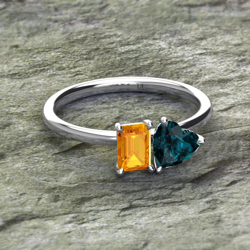 Simple and beautiful, this enchanting 2 Stone Duo Ring flaunting an Emerald Shape Citrine dazzling along with Heart Shape London Blue Topaz are perfect for the women who have a modern outlook and are willing to be unique.