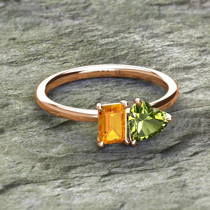 Simple and beautiful, this enchanting 2 Stone Duo Ring flaunting an Emerald Shape Citrine dazzling along with Heart Shape Peridot are perfect for the women who have a modern outlook and are willing to be unique.