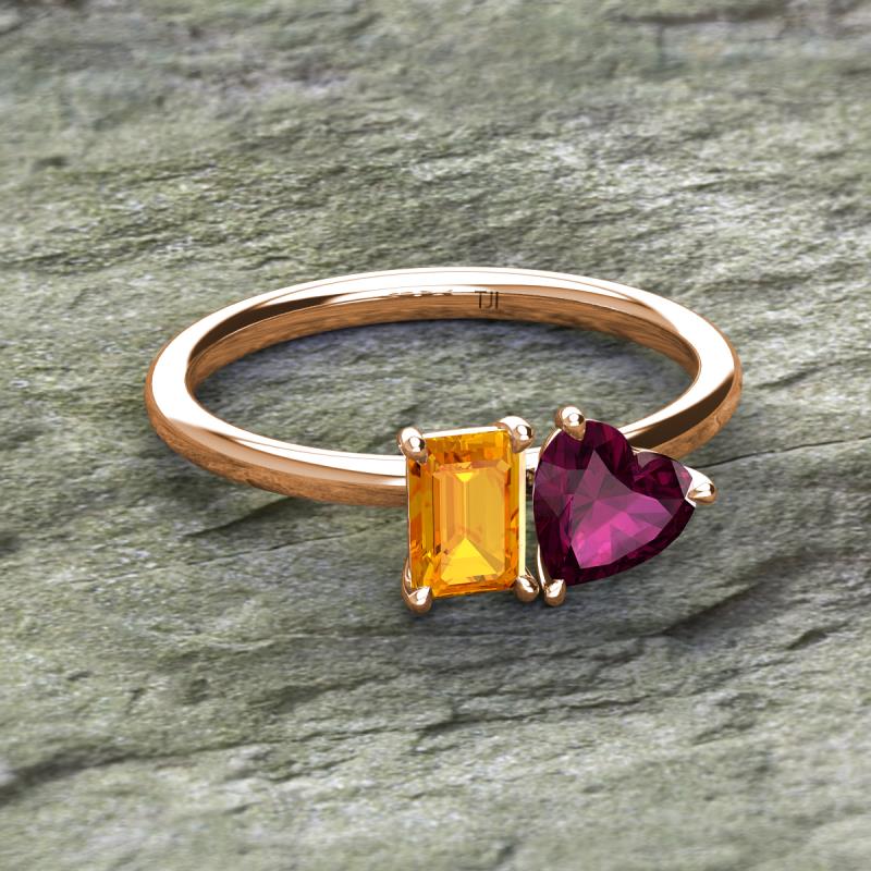 Simple and beautiful, this enchanting 2 Stone Duo Ring flaunting an Emerald Shape Citrine dazzling along with Heart Shape Rhodolite Garnet are perfect for the women who have a modern outlook and are willing to be unique.