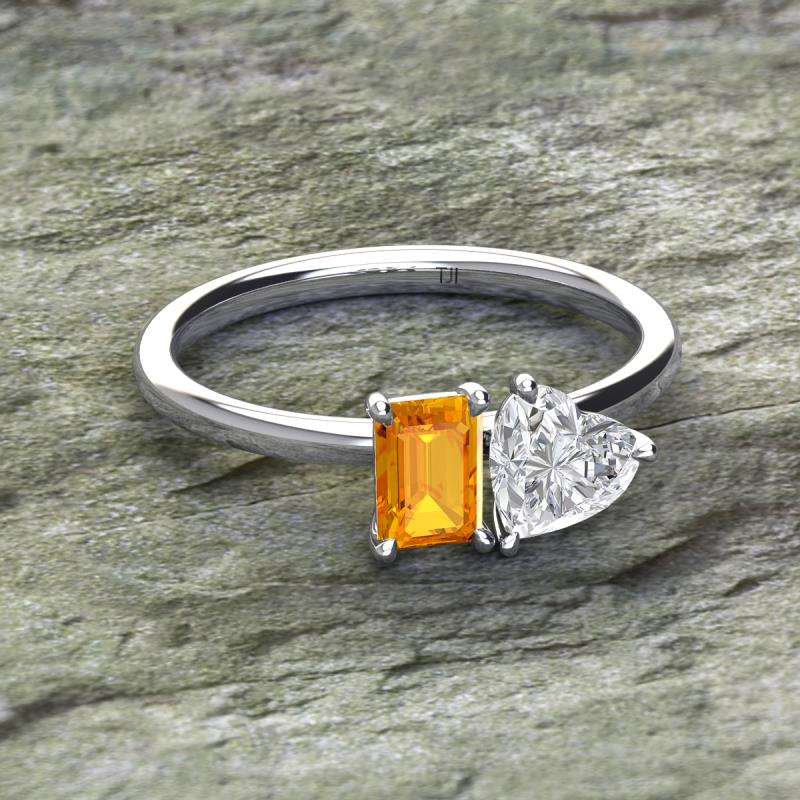 Simple and beautiful, this enchanting 2 Stone Duo Ring flaunting an Emerald Shape Citrine dazzling along with Heart Shape White Sapphire are perfect for the women who have a modern outlook and are willing to be unique.