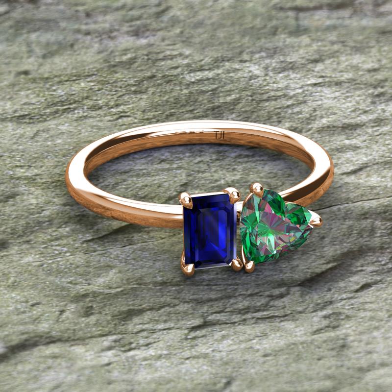Simple and beautiful, this enchanting 2 Stone Duo Ring flaunting an Emerald Shape Created Blue Sapphire dazzling along with Heart Shape Lab Created Alexandrite are perfect for the women who have a modern outlook and are willing to be unique.