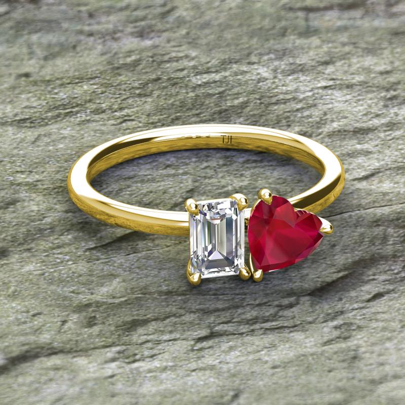 Simple and beautiful, this enchanting 2 Stone Duo Ring flaunting an Emerald Shape Forever Brilliant Moissanite dazzling along with Heart Shape Lab Created Ruby are perfect for the women who have a modern outlook and are willing to be unique.