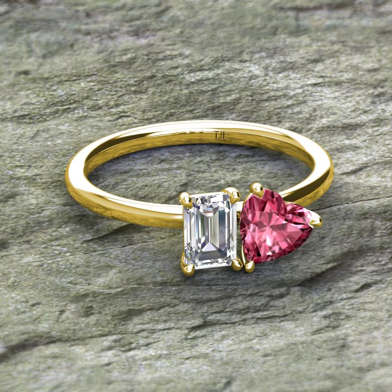 Simple and beautiful, this enchanting 2 Stone Duo Ring flaunting an Emerald Shape Forever Brilliant Moissanite dazzling along with Heart Shape Pink Tourmaline are perfect for the women who have a modern outlook and are willing to be unique.